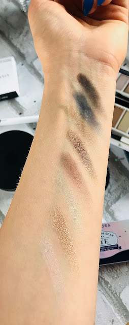 Cienie niestety trochę mnie zawiodły. Są dość suche i do mocno napigmentowanych nie należą, ale kolory są naprawdę ładne i moim zdaniem dobrze dobrane. Brakuje mi jedynie bazowego cienia. Jest małych rozmiarów, więc nada się w podróż. Jest idealna do dziennych, zwykłych makijaży. Wieczorowego makijażu nią nie stworzycie ze względu na pigmentację. Poniżej zobaczycie swatche. Po tym ciemnym granatowym spodziewałam się znacznie więcej. A wygląda jakby był wyblakły. Może to, że jest to w pełni naturalny produkt, ma na to wpływ. Nie wiem, nie miałam wcześniej paletki cieni z dobrym składem. Z reguły były to palety drogeryjne, w których nie brak substancji zapachowych oraz talku. Inaczej w przypadku paletki Lily Lolo, która jest idealna dla wegan oraz alergików. Nie mówię, że to zła paleta, ale na dany moment oczekuję od cieni do powiek czegoś więcej ;) Na pewno będzie idealna dla osób początkujących oraz takich, które stawiają na delikatny, naturalny makijaż.
